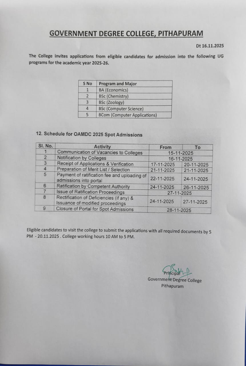 Government Degree College, Pithapuram was established in the year 2008 and currently offers 5 UG programs in Single Major System namely BA (Economics), BSc9Chemistry), BSc(Zoology), BCom (Computer Applications) and BSc (Computer Science). Over a period of time the college has achieved good results in serving the higher education needs of Pithapuram and surrounding mandals and has been a favourite among the students of this area. The college has progressed swiftly on the development path and earned a reputation for quality education and student centric methods in teaching learning process. Overall the college offers students with ample opportunities to grow and be ready for the ever changing environment.